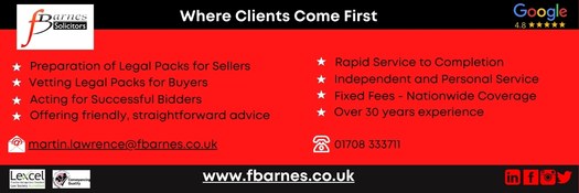 We offer fixed fees and deal with all types of property. Auction property transactions are conducted under very strict timelines and the legal representative needs to know what they are doing. We would recommend you choose your legal representation carefully to avoid disappointment. F Barnes are rated 4.8 out of 5 on Google and we recommend you take a look at what people are saying for yourselves.